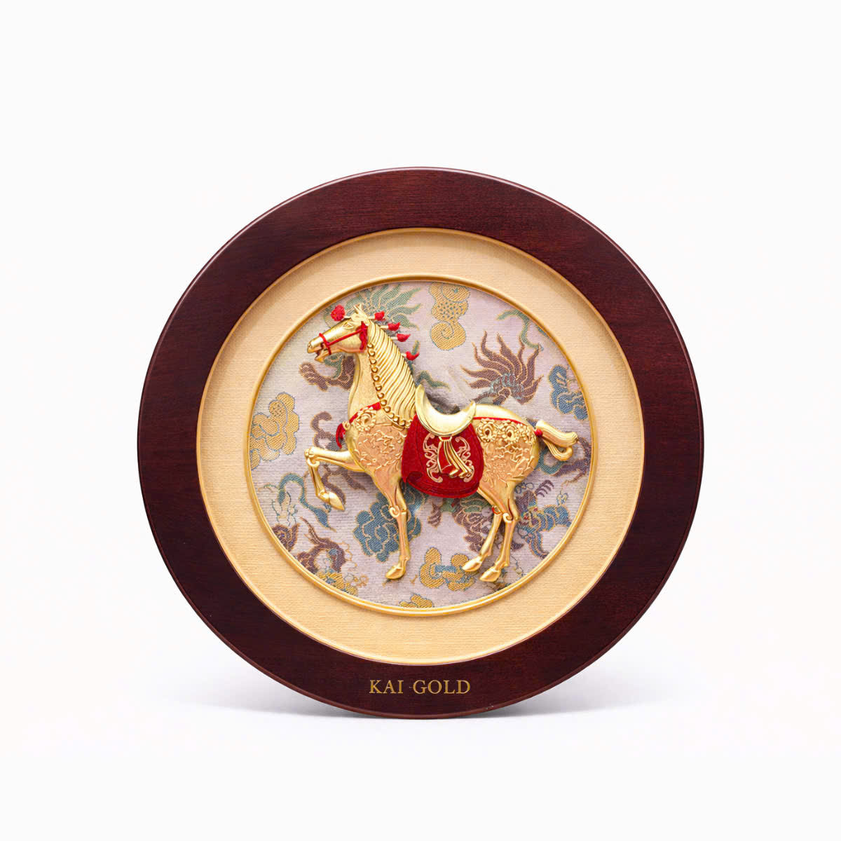 Bức tranh được thể hiện theo bố cục tròn – biểu trưng cho sự trọn vẹn, liên tục và bền vững. Hình tượng ngựa dát vàng nổi khối ở vị trí trung tâm, tư thế mạnh mẽ, đầu ngẩng cao, tạo cảm giác chủ động và tiến bước. Phần nền họa tiết cổ điển kết hợp sắc đỏ – vàng hài hòa, vừa tôn bật chủ thể, vừa giữ được chiều sâu mỹ thuật